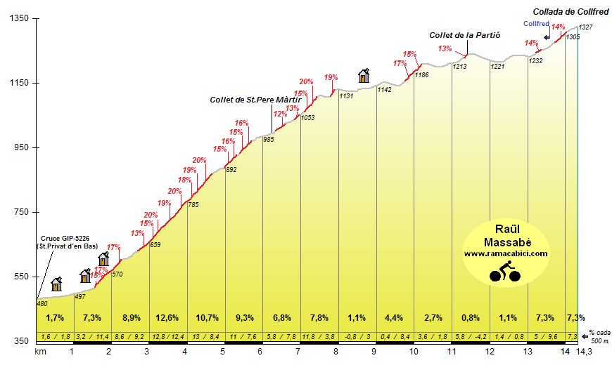 Famós per la seva duresa dins el món ciclista és el port de muntanya asfaltat més dur de La Garrotxa. En aquest aspecte destaca pels 4 quilòmetres a més del 10% de pendent mitjà que té a la seva part inicial i per les seves rampes que en alguns punts arriben al 20%.